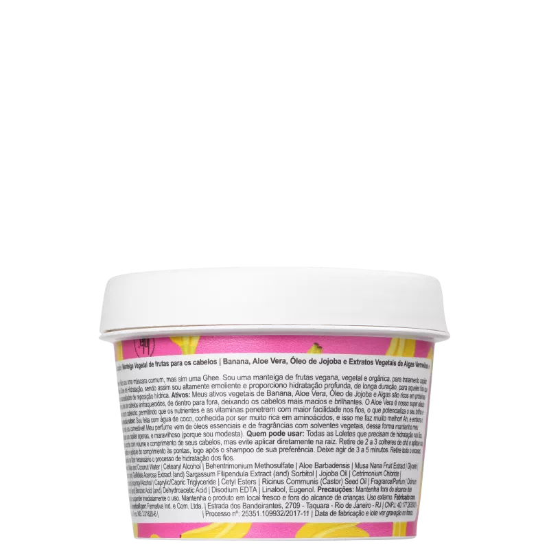 Ação / Resultado: A combinação dos ativos Banana, Óleo de Jojoba e Algas, ricos em proteínas, atua de dentro para fora, aumentando a resistência e a durabilidade da hidratação, especialmente nas áreas mais enfraquecidas dos fios. A Aloe Vera presente na fórmula facilita a entrada dos nutrientes na fibra capilar, intensificando o tratamento. Importante ressaltar que o produto não é comestível.