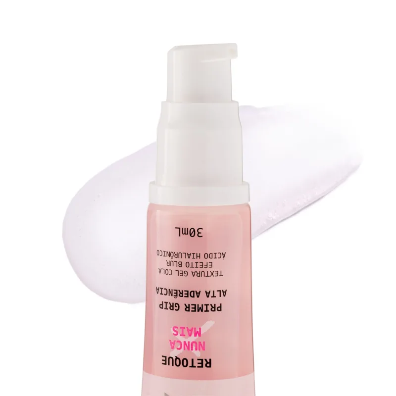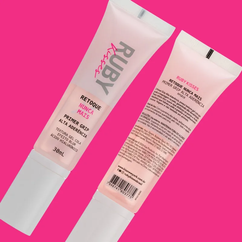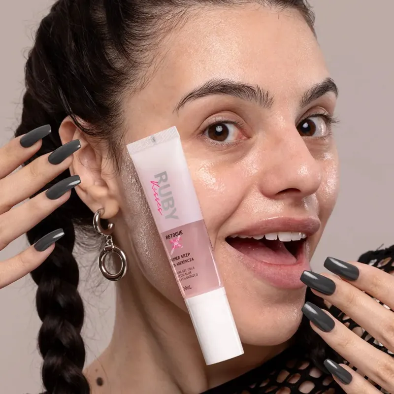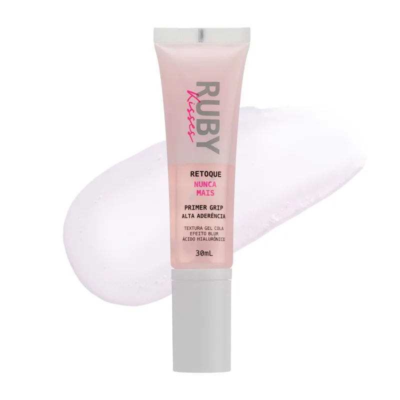 Primer Grip. Ruby Kisses Retoque Nunca Mais Alta Aderência possui textura gel cola que gruda a maquiagem na pele, garantindo alta durabilidade e hidratação.